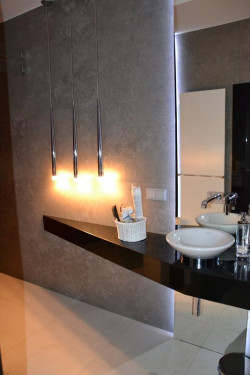 - W łazience – na ścianach grafitowe płyty gresu (40 x 80 cm).