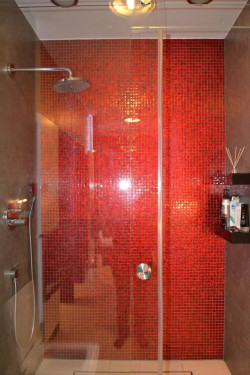 - Łazienka – ściana pod prysznicem obłożona czerwoną, szklaną mozaiką.