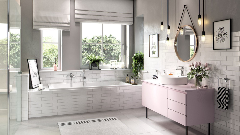 Przestronność i jasność pomieszczenia podkreślają duże okna oraz białe płytki w stylu "metro", które odbijają słońce. Strefa umywalkowa wyróżnia się pasteloworóżową szafką na cienkich, czarnych nóżkach, przypominającą komodę. Armatura ALBA VERDELINE, wyposażona w perlatory, obejmuje zarówno baterię umywalkową, jak i wannową, sparowaną z natryskiem SINUS. Chromowana powłoka tych elementów i akcesoriów, jak wieszak na ręcznik AUDREY interesująco wygląda obok czarnych detali. Lustro w drewnianej ramie i asymetrycznie rozmieszczone industrialne lampy dodają wnętrzu klimatu. Całość uzupełniają dekoracyjne grafiki i rośliny.