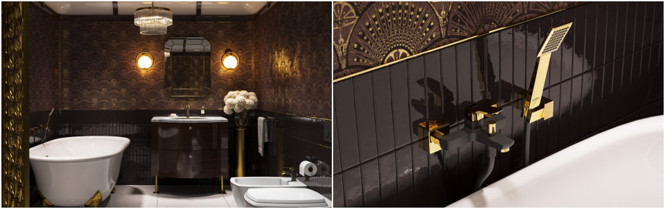 Styl glamour inspirowany estetyką art déco to bogata i wyrafinowana atmosfera, z dominacją ciemnych odcieni brązu i złotych akcentów. Na blacie oryginalnej szafki z szufladami umieszczono elegancką baterię VITTO BLACK/GOLD VERDELINE łączącą połyskujące złoto i matową czerń. Jej geometryczna forma, lekko zaokrąglona wylewka i spłaszczony uchwyt prezentują się wytwornie. Rama lustra o unikalnym kształcie nawiązuje do dekoracyjnych motywów wachlarzy. Symetrycznie rozmieszczone kinkiety emitują ciepłe, nastrojowe światło, wzbogacając atmosferę, a imponujący żyrandol stanowi efektowny element dekoracyjny. Baterie z tej samej kolekcji zostały także zastosowane przy wannie na lwich nogach oraz bidecie, wprowadzając spójność stylistyczną.