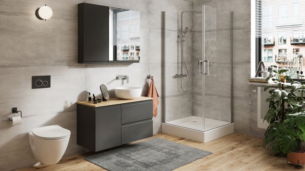 Kolejna wariacja na temat minimalizmu. W tej kombinacji stylów loftowego z industrialnym, surowość aranżacji przełamujemy nowoczesnymi dodatkami. W sąsiedztwie ultra eleganckich dodatków, to prostota może uchodzić za wyrafinowaną nonszalancję. Na tle betonowej ściany montujemy designerski przycisk spłukujący w czarnym macie i efekt wow mamy gwarantowany. Ponownie dzięki połączeniu trendów mamy możliwość wprowadzenia pewnej awangardy według własnej interpretacji przestrzeni. Dlatego w łazience nie może zabraknąć przenikających się różnorodnych faktur i materiałów. Rośliny podkreślą bliskość z naturą, czego również przejawem będzie wybór ekologicznych rozwiązań technologicznych, jak choćby zastosowane w przyciskach do spłuczek od Cersanit, dwudzielny system oszczędnego zużycia wody. W takiej łazience proste kąty kabiny prysznicowej podkreślą architektoniczną dyscyplinę, jaka charakteryzuje typowy loft.