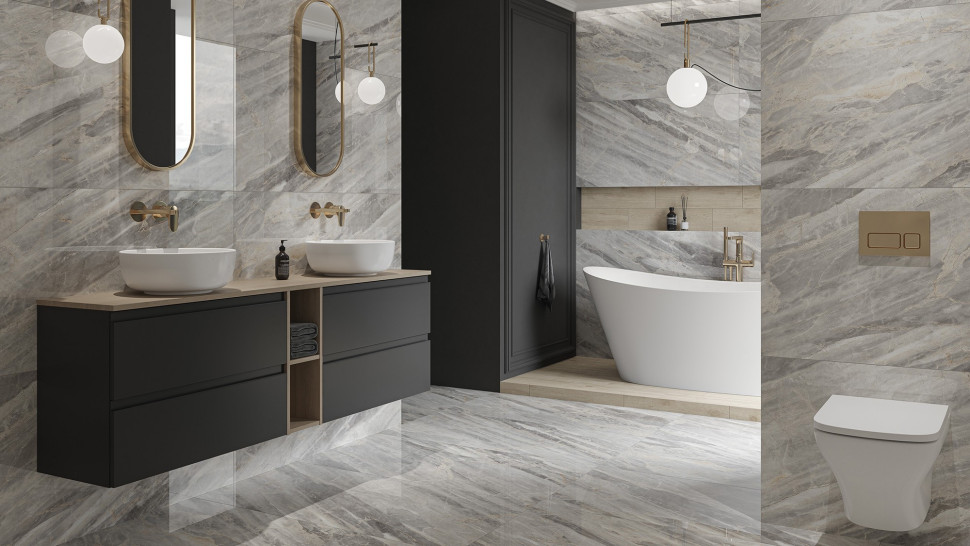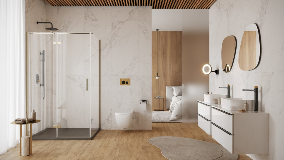 Klasyczny glamour w nowoczesnej odsłonie to już nie przepych, splendor i niczym nieuzasadniony blask, ale upodobanie do materiałów najwyższej jakości, które wybrzmiewają za sprawą drobnych akcentów. Tu detal podkreśla rangę całego otoczenia. Baterie najwyższej generacji przy umywalkach nablatowych i wannie wolnostojącej, nóżki oraz gałki marmurowych frontów szafek, czy też przyciski spłukujące nad miskami zawieszanymi. Nie wszystko złoto, co się świeci, ale i co nie świeci może być złotem. Złote przyciski do spłuczki o matowym wykończeniu marki Cersanit wspaniale podkreślą niedoścignioną elegancję marmurów i staną się wizytówką nowoczesnej łazienki 2025 roku.