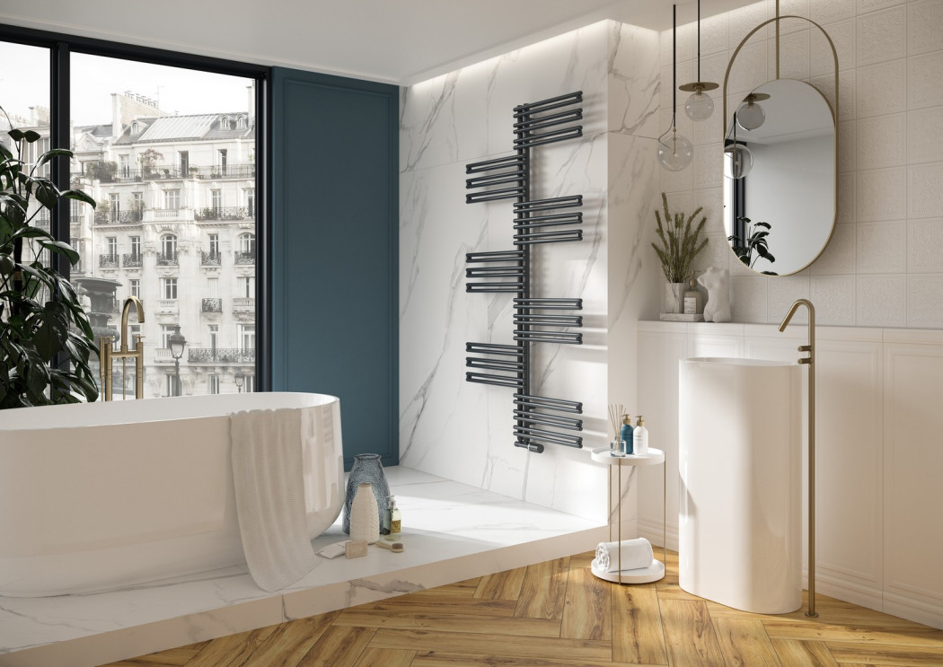 Łazienkowy grzejnik dekoracyjny Twist marki Purmo to model z kolektorami poziomymi zwróconymi zarówno w lewą, jak i w prawą stronę. Idealnie wyważony, atrakcyjny wizualnie, z wystarczającą ilością miejsca na suszenie ręczników. Podobnie jak w jak w przypadku grzejnika GATE istnieje możliwość obracania.