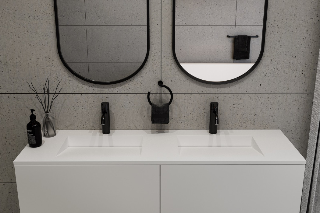 Biała, podwójna umywalka Luxum z odpływem liniowym to przykład realizacji na wymiar. Gładka, satynowo-matowa powierzchnia oraz wysokiej jakości materiał - autorski GFK Luxum® zapewniają unikatowe i trwałe wyposażenie do łazienki. Płyty z lekkiego, naturalnego betonu architektonicznego będą doskonałym uzupełnieniem aranżacji, tworząc elegancję w duchu minimalizmu.