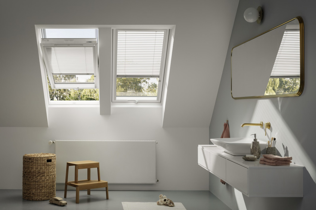Do łazienki - gdzie gromadzi się para i wilgoć - najlepszym wyborem będą drewniano-poliuretanowe okna dachowe VELUX. Są odporne na wilgoć i nie wymagają konserwacji przez wiele lat użytkowania, wystarczy tylko zwykłe mycie. Białe wykończenie sprawia, że doskonale komponują się z nowoczesnym wystrojem wnętrz. Okno zostało wyposażone w energooszczędny, dwukomorowy pakiet szybowy, który jeszcze lepiej chroni przed ucieczką ciepła z domu i wpływa na obniżenie rachunków za ogrzewanie. Dostępne także w wersji z górnym systemem otwierania.