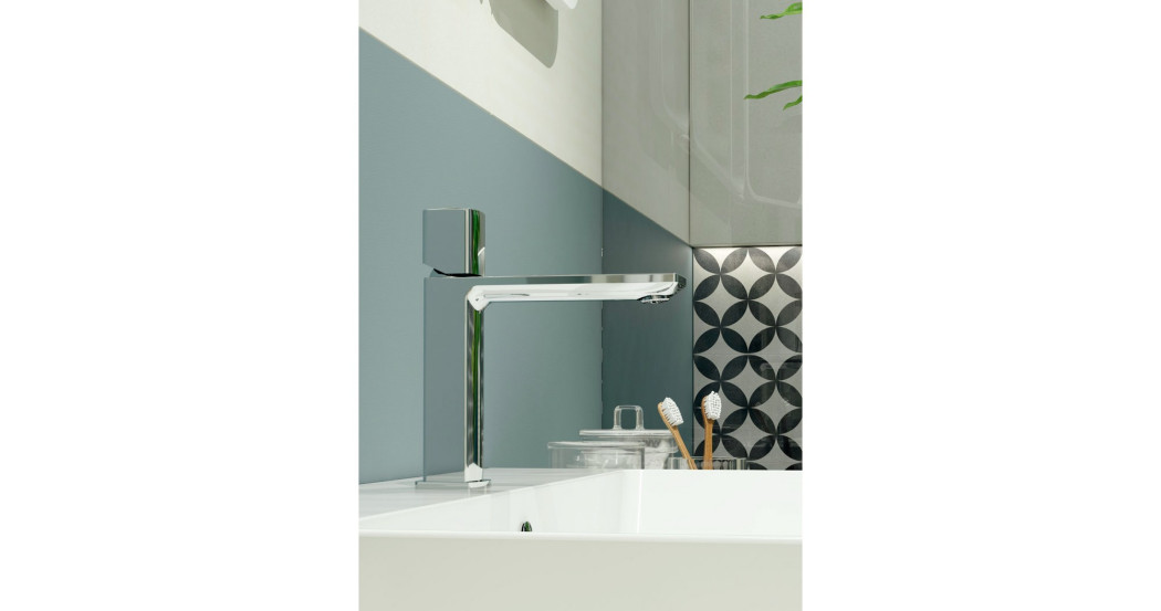 Baterię umywalkową Morganit wyróżnia uchwyt wkomponowany w kształt bryły baterii. Prosty design podkreśla również zlicowany z baterią napowietrzacz.