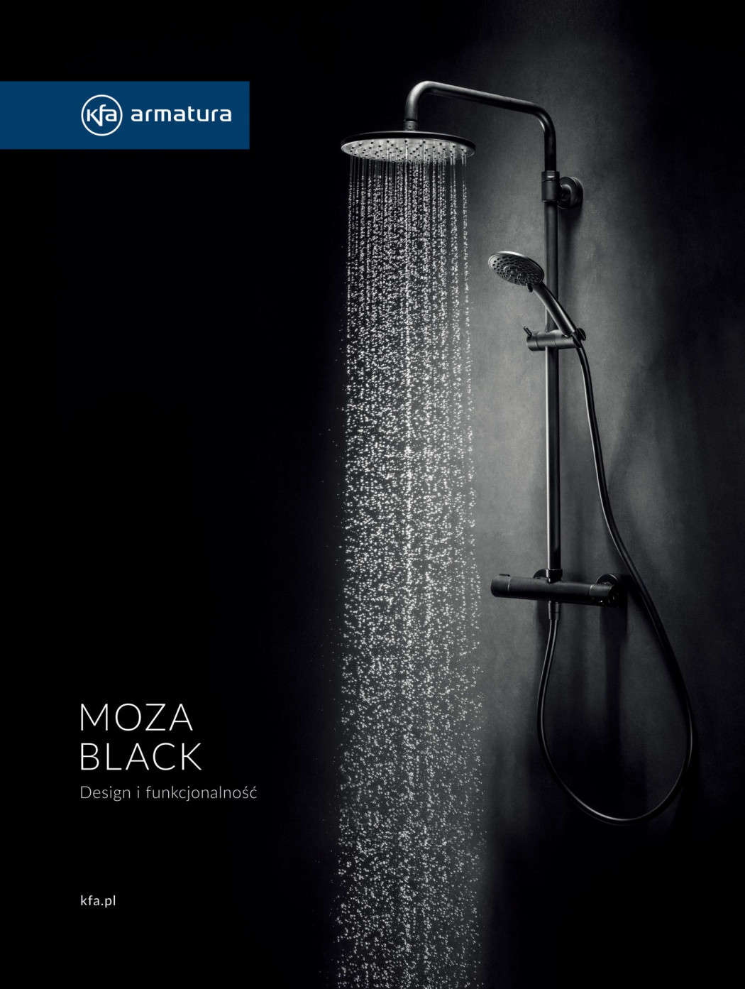 Czarna deszczownia Moza Black z najnowszej oferty marki KFA Armatura. Jej matowa powłoka powstaje w innowacyjnym procesie produkcyjnym, na który składa się kilkanaście etapów. Efektem tego jest nie tylko głęboki, intensywny kolor, ale również wysoka odporność na uszkodzenia.