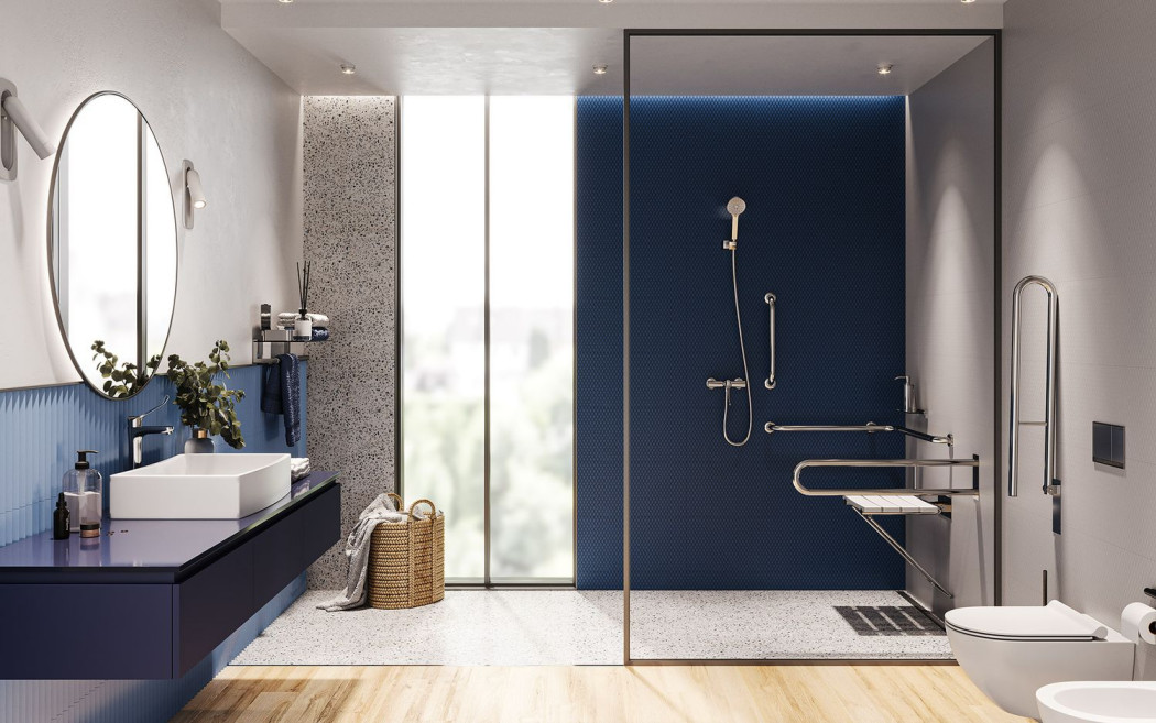 Do tej wygodnej łazienki wybrano elegancką armaturę z serii Algeo Medico ze specjalistycznymi uchwytami, którymi temperaturę wody i siłę strumienia ustawia się za pomocą łokcia czy nadgarstka. Pod prysznicem i przy sedesie zamontowano solidne poręcze i uchwyty z kolekcji Metalia Help. Wykonane ze stali szlachetnej składane siedzisko ułatwi starszej osobie kąpiel. Zarówno baterie, jak i akcesoria są atrakcyjne wizualnie, dobre jakościowo, trwałe.