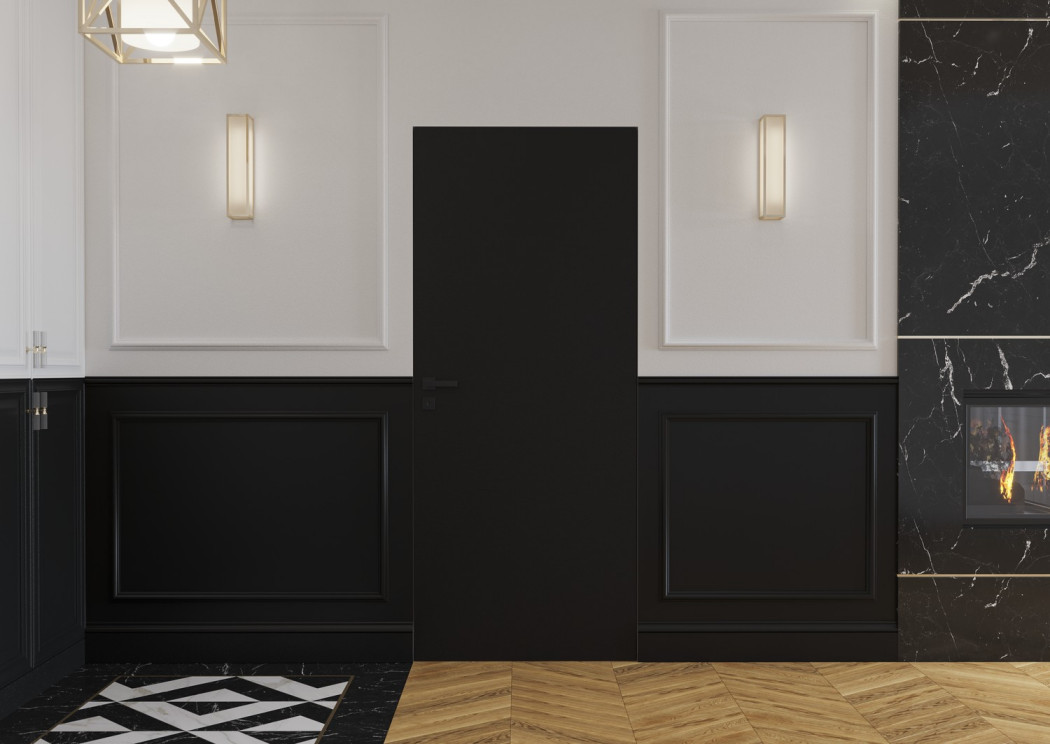 Czarne drzwi z drewnianą podłogą będą prezentować się genialnie. Przede wszystkim elementy dekoracyjne takie jak np. sztukateria na ścianach lub oświetlenie. Drzwi ukryte w ścianie będą niezauważalne. Kapitalnie współgrają ze stylem minimalistycznym jak również nowoczesnym.