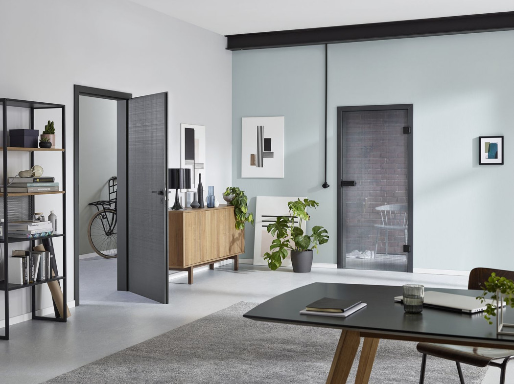 Przylgowe drzwi drewniane z powierzchnią imitującą strukturę lnu (dostępne 5 kolorów: biały, jasnoszary, popielaty, antracytowy i brązowoszary). Drzwi mają zabezpieczenie krawędzi 4Protect. Do drzwi drewnianych z powierzchnią o fakturze lnu harmonijnie dopasować można drzwi pełnoszklane z takim samym nadrukiem