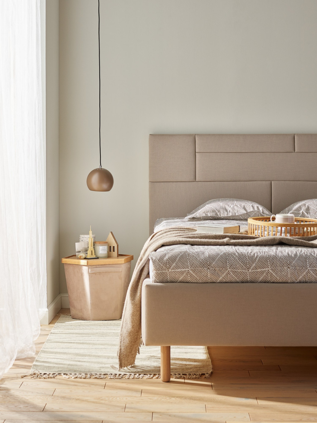Łóżko tapicerowane Harmonic tworzy komfortowe warunki do snu i wieczornego wypoczynku dla 2 osób. Mebel posiada uchylny stelaż i duży pojemnik na pościel. Zagłówek z ozdobnym pikowaniem stanowi miękkie oparcie dla pleców. Produkt jest tworzony na zlecenie klienta - zamawiający sam wybiera tkaninę obiciową i wariant nóżek.