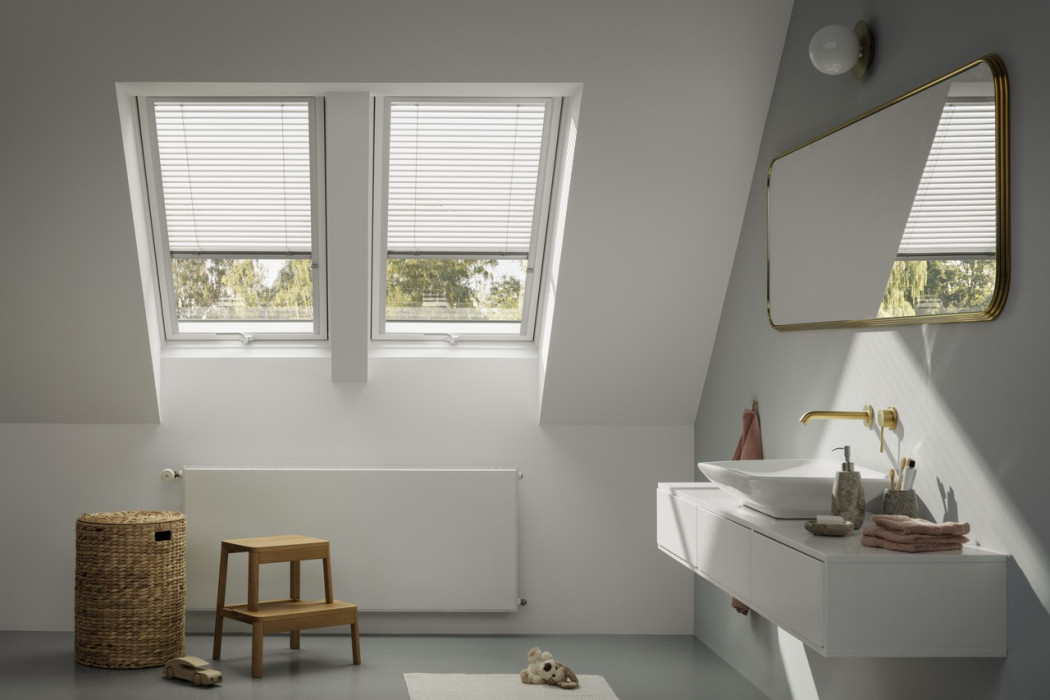 Drewniano-poliuretanowa konstrukcja okien dachowych VELUX GLU 0064B idealnie nadaje się do łazienki, bo jest całkowicie odporna na wilgoć, a dodatkowo energooszczędna. Dzięki wydajnej wentylacji i wygodnej klamce z łatwością przewietrzysz po każdej kąpieli. Dobrym ich dopełnieniem będą wodoodporne żaluzje PAL, które zapewnią prywatność i ochronę przed słońcem.