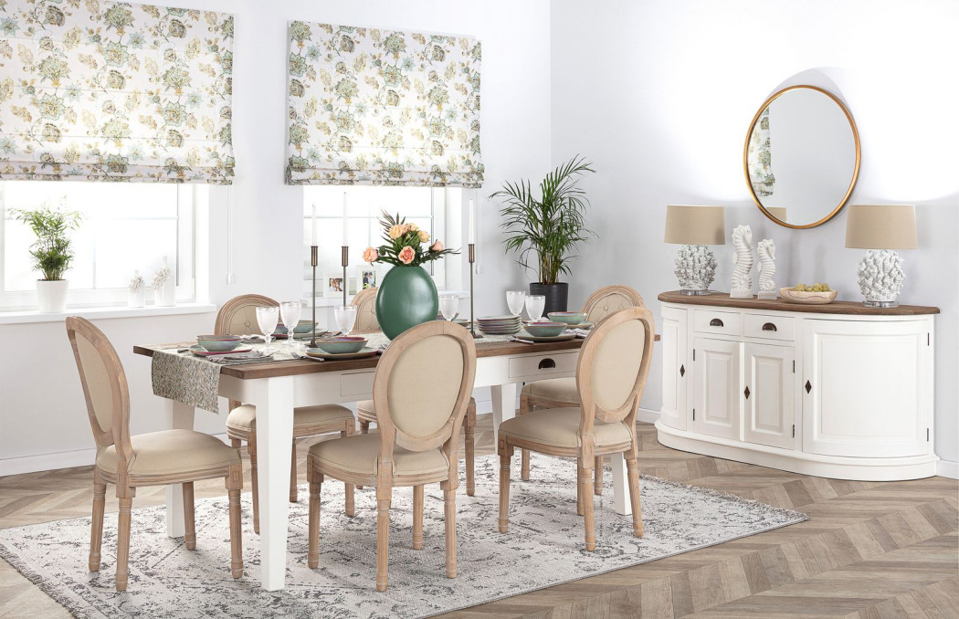 Powitaj wiosnę świeżym, kwiatowym akcentem! Rustykalna jadalnia wzbogacona o rolety rzymskie o oryginalnym florystycznym motywie oraz bieżnik prostokątny szyty na wymiar z tkaniny tej samej serii to wspaniała propozycja na wiosenną aranżację wnętrza.