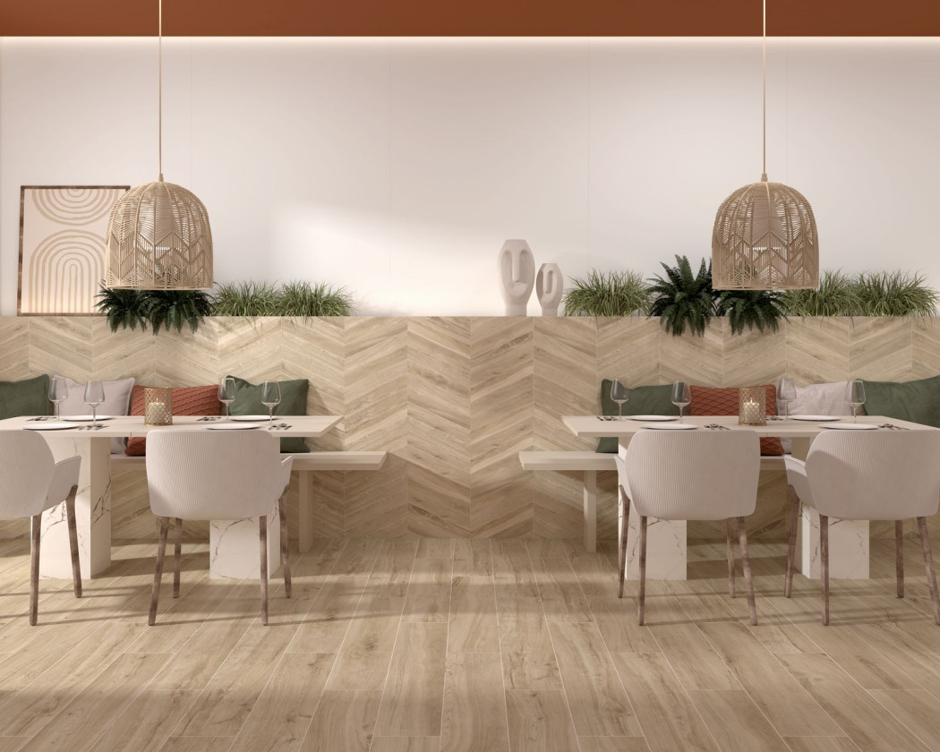 Drewnopodobna kolekcja płytek ceramicznych Porto od Ceramica Limone to czysta francuska elegancja. Wzór chevronu, niegdyś zdobiący arystokratyczne wnętrza, teraz może zawitać w przestrzeni każdego, kto ceni ponadczasowe, uniwersalne a zarazem trwałe rozwiązania. Płytki dostępne w formacie 8x40 cm można ułożyć wedle uznania pionowo, poziomo lub pod kątem 45 stopni na wzór francuskiej jodełki. Format 20x120 cm doskonale uzupełnia kolekcję.