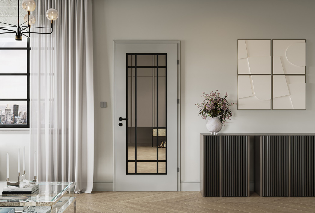 W ostatnim czasie coraz większą popularnością cieszą się drzwi ze szprosami – delikatnymi, naklejanymi listwami dekoracyjnymi. Ozdobne podziały, w zależności od modelu, różnią się układem i są dostępne w wersji czarnej lub w kolorze skrzydła. Model Perla w dekorze Grau w połączeniu z czarnymi szprosami prezentuje się niezwykle oryginalnie i elegancko, tworząc wnętrze o wyjątkowym, zindywidualizowanym charakterze.