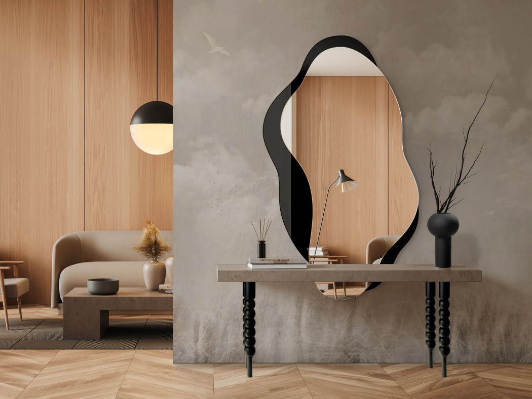 Lustro Libido, z kolekcji Amore, to dekoracyjny element o nieregularnym, organicznym kształcie. Składa się z dwóch tafli: czarnego szkła Lacobel i lustra opti white. Kontrastujące materiały tworzą harmonijną całość. Falujące kształty lustra, przywodzące na myśl miłosny uścisk, wprowadzają do wnętrza lekkość i miękkość. Lustro Libido to świetny wybór do nowoczesnych sypialni, salonów czy przedpokojów. Lustro dostępne w wielu rozmiarach.