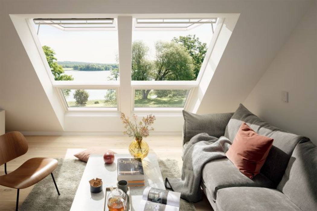 Elektryczne okno klapowo-obrotowe, które można wygodnie otwierać i zamykać za pomocą klawiatury naściennej lub aplikacji w telefonie w przypadku połączenia z systemem kontroli klimatu VELUX ACTIVE.