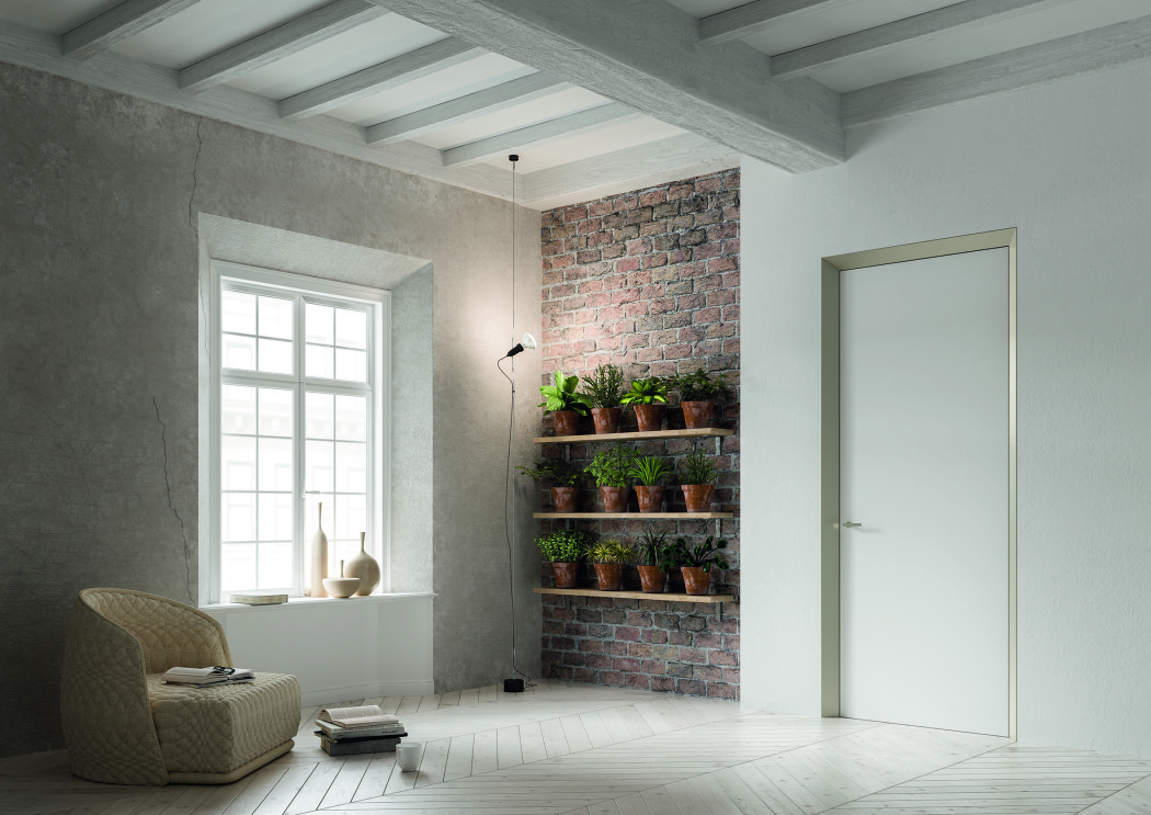 Drzwi rozwierane ukryte ECLISSE 40 jest pierwszym produktem ECLISSE eksponującym ościeżnicę: pochylona rama wyłania się ze ściany tworząc dyskretną lecz widoczną ozdobę.