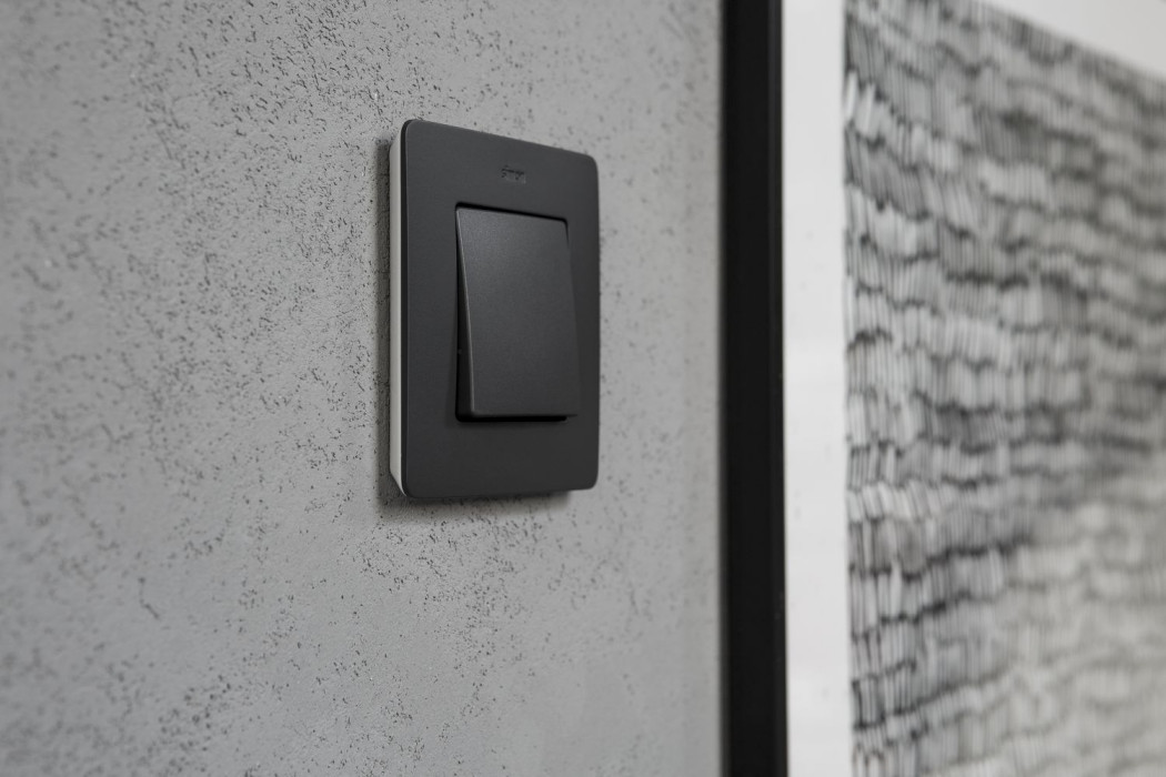 Łącznik pojedynczy w grafitowej ramce dekoracyjnej Simon 82 Detail z białą podstawą.