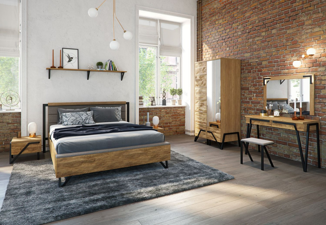 Sypialnia Pik to wyjątkowa kolekcja mebli z frontami z litego drewna i korpusami w okleinie naturalnej. Zachwyca oryginalnymi bryłami w stylu industrialnym oraz piękną kolorystyką: dąb naturalny lager. Dębowe elementy zostały poddane procesowi głębokiej strukturyzacji, dzięki czemu meble zyskały niepowtarzalny charakter. Metalowe nogi i pochwyty wspaniale podkreślają loftowy styl kolekcji.