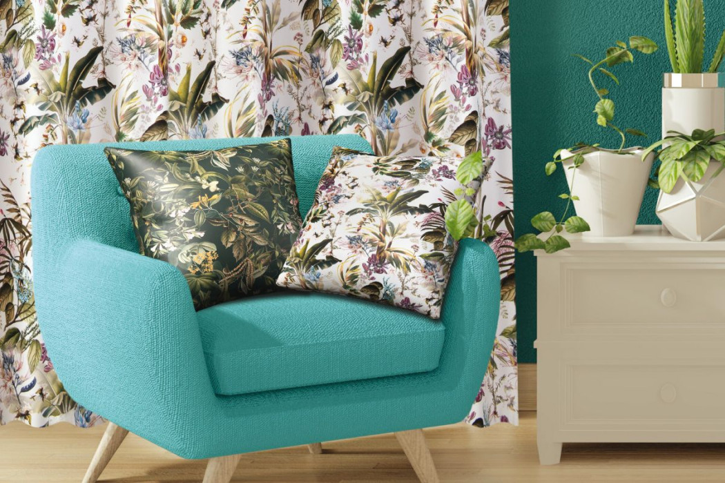 VERI DRUK 1661 Tkanina dekoracyjna drukowana z motywem egzotycznych liści i kwiatów w lekkim klimacie retro, inspirowana szkicami z atlasów botanicznych.